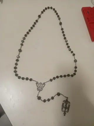 Antiguo rosario con cuentas de color granate y detalles metálicos. La medalla central presenta una inscripción. - Diseño clásico. - Ideal para coleccionistas.- precio negociable
