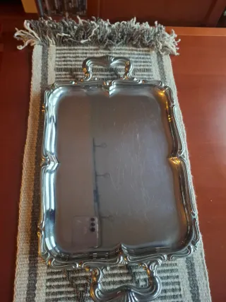 Elegante bandeja plateada con detalles en relieve y asas. - Diseño alargado. - Acabado plateado brillante.