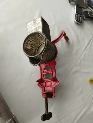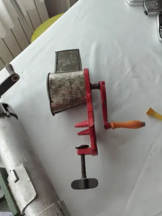 Máquina picadora antigua de la marca Elma, fabricada en hierro colado. - Diseño clásico y robusto. - Mecanismo de manivela. - Base con tornillo de sujeción.