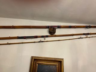 Conjunto de cañas de pescar antiguas fabricadas en bambú. Piezas de colección con detalles en rojo y negro. - Material: Bambú - Color: Madera natural, rojo y negro