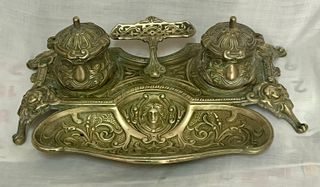 Elegante escritorio de bronce con un diseño intrincado, datado del siglo XIX. Presenta dos tinteros con tapas ornamentadas y una bandeja. -Dimensiones 29 x 18 cm - Material: Bronce - Época: Siglo XIX - Decoración detallada con motivos clásicos y rostro humano.