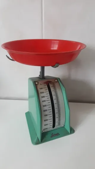 Balanza de cocina vintage de la marca Bernar, con un diseño retro y funcional. - Escala de medición hasta 1000 gramos. - Cuerpo de metal en color verde menta. Escenografía atrezo utilería decoración