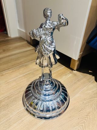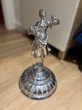 Elegante escultura metálica con acabado cromado, para grifo de cerveza vintage. La figura representa a una persona con un delantal y sosteniendo jarras. - Base ornamental con detalles. - Diseño detallado de la figura.
