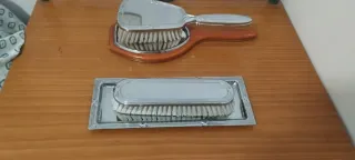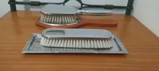 Conjunto de tocador antiguo con cepillos. - Cepillo de mano con mango de madera y detalles metálicos. - Cepillo pequeño con base metálica. - Bandeja metálica decorada.