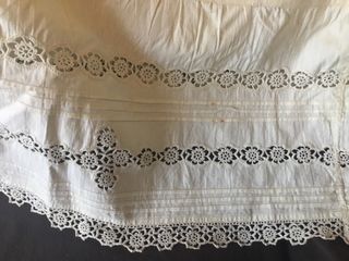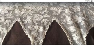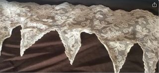 Preciosa puntilla de encaje con diseño religioso. 3 metros 70 cm - Elaborada con hilo fino,parece bolillos - Patrón intrincado y detallado. - Borde festoneado. 8 cm de ancho Sin uso