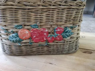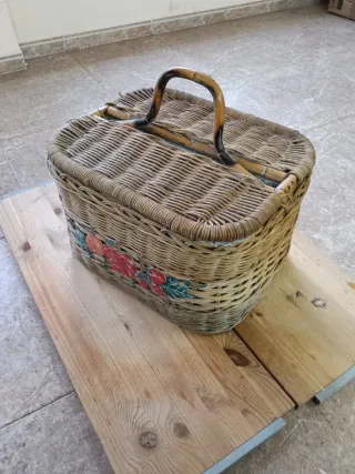Cesta de picnic vintage de mimbre con un diseño encantador. - Material: Mimbre - Decoración: Motivos florales de algún material ceramico en la parte frontal - Asa: Asa de madera para facilitar su transporte Original quizá de los años 60