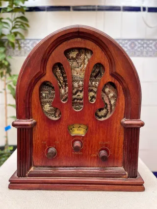 Radio de estilo vintage con un diseño clásico en madera. - Acabado en madera oscura. - Detalles ornamentales en la parte superior. - Dial de sintonización y controles. - Altavoz con rejilla decorativa.