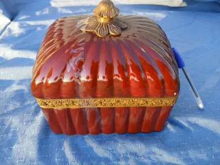Elegante cofre vintage con un acabado esmaltado en tonos burdeos y detalles dorados. Una pieza decorativa con un diseño único. - Diseño esmaltado en burdeos. - Adornos y detalles en dorado. - Estilo vintage.