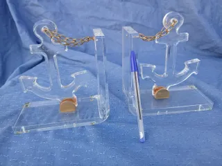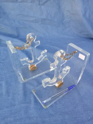 Set de dos sujetalibros con diseño de ancla náutica. - Fabricados en metacrilato transparente. - Detalle de cadena dorada. - Base con disco de latón.