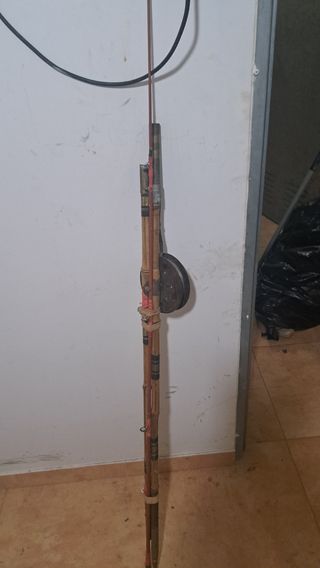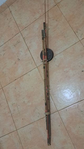 Caña de pescar antigua fabricada con materiales naturales. - Construcción en bambú. - Detalles en hilo rojo y negro. - Incluye carrete metálico.