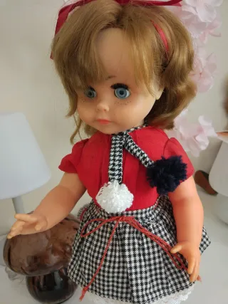 Preciosa muñeca antigua de los años 70, ideal para coleccionistas. Se encuentra en buen estado de conservación, considerando su antigüedad. - Muñeca de vinilo con ojos azules. - Pelo castaño con lazo rojo. - Vestido rojo y falda de cuadros blancos y negros. - Zapatos blancos.