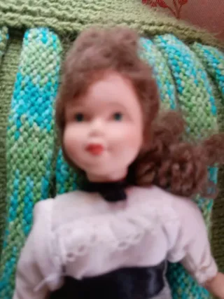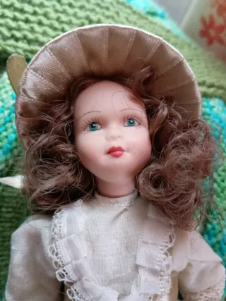 Preciosa muñeca de porcelana con un elegante sombrero. - Detalles faciales pintados a mano. - Vestido de época con encajes. - Cabello castaño ondulado.