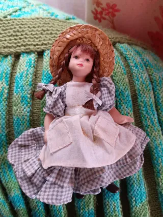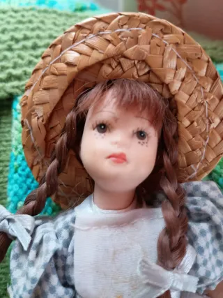 Preciosa muñeca de porcelana con un encantador sombrero de paja. - Vestido a cuadros. - Trenzas. - Detalle de bolsillos en el vestido.