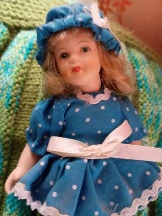 Preciosa muñeca de porcelana con un vestido azul de lunares blancos. - Vestido azul con lunares blancos. - Adorno de encaje blanco en el cuello y bajo del vestido. - Lazos blancos decorativos.