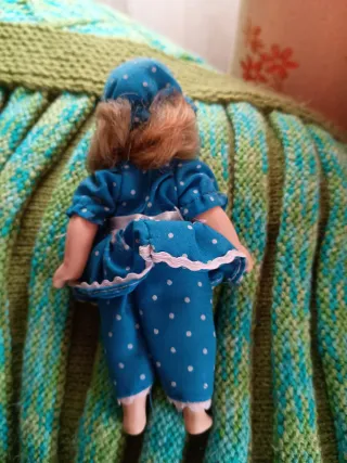 Precioso muñeco de porcelana con detalles pintados a mano. - Cuerpo de porcelana. - Vestido con un traje de lunares. - Incluye un gorrito a juego.