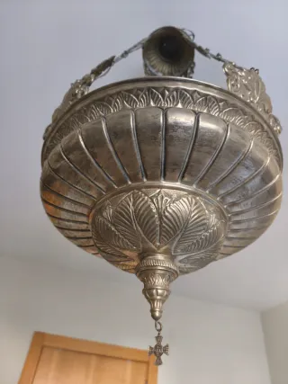 Lámpara aceitera votiva de metal. La instalación eléctrica es nueva. Mide 75 cm x 35 de ancho. (No leer: antiguo antigua iglesia santo santa religioso religiosa laton bronce dorado conventual sacristía liturgia cirios pintura altar convento retablo hornacina hermandad cofradía antiguedades madera tela talla tallado óleo sacro cristal flores lienzo oleo cuadro pintura custodia caliz peana mensula virgen cristo oro plata ceramica porcelana rosarios crucifijo rosario relicario reliquia siglo XVIII XVII XIX escapulario peana votiva cornucopias )