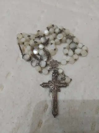 Precioso rosario antiguo, datado en el siglo XIX. Combina la delicadeza del nácar con la elegancia de la filigrana de plata. - Cuentas de nácar (madreperla). - Detalle de filigrana en plata. - Colgante con cruz. - Mide extendido 41,5 centímetros de largo y las esferas tienen un diámetro de 0,5-0,7 centímetros.