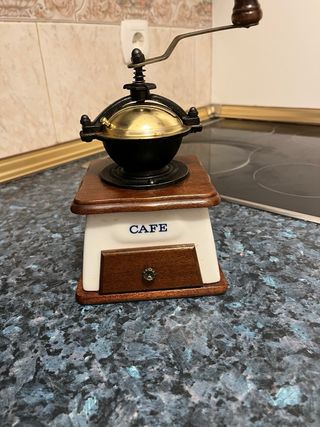 Molinillo de café de estilo vintage con base de madera y detalles metálicos. - Diseño clásico. - Cajón extraíble para el café molido. - Acabado en madera oscura y metal dorado.