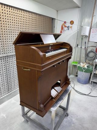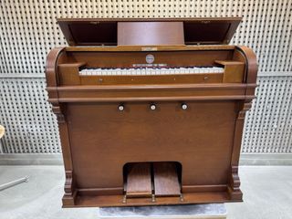 Antiguo órgano de aire de la marca COTRINA. Un instrumento clásico con un diseño de madera elegante. - Mecanismo de fuelle. - Teclado de madera. - Pedales inferiores.