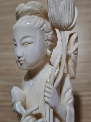 Figura decorativa de una geisha sosteniendo una flor de loto. - Detallada escultura. - Base ornamental.