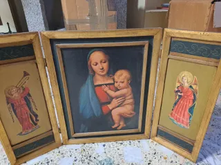 Tríptico religioso con la representación de la Virgen con el Niño en el panel central. Los paneles laterales muestran ángeles. - Raffaello Sanzio,1505, c. 1912 - Marco dorado. - Decoración en los laterales.