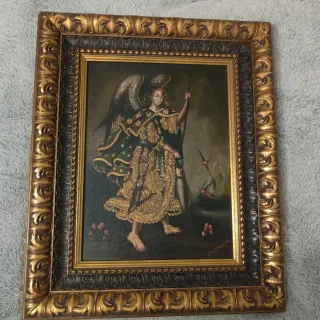 Obra de la Escuela Cuzqueña, arcángel arcabucero (San Miguel Arcángel) Autor V. Raul Noa. Q. Estilo del Barroco Novohispano del siglo XVII, representa a los ángeles con un arcabuz. Técnica de brocateado y pan de oro (vestimenta del ángel) Tamaño lienzo: 30x40cm Tamaño cuadro: 50x60cm