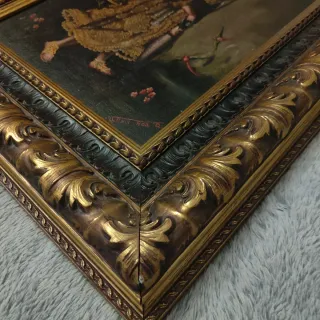 Pintura al óleo de una escena de caza con perros y un cazador. El cuadro está adornado con un marco dorado. - Representación detallada de la naturaleza y los animales. - Marco con ornamentos dorados.