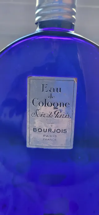 Botella de perfume vintage de la marca Bourjois. - Botella de cristal azul. - Etiqueta con Eau de Cologne Soir de Paris. - Tapón metálico.