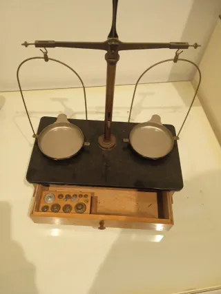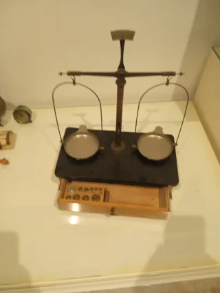 Balanza de precisión antigua, ideal para coleccionistas o como pieza decorativa. - Construcción robusta. - Incluye juego de pesas.