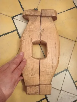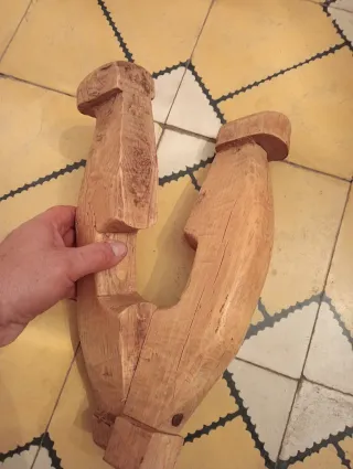 Rara pieza de madera tallada a mano, de carácter etnográfico, pulida y encerada . Su diseño evoca un elemento tradicional de trabajo. Utilizada para poner en la pata de las caballerías , burros , mulos , caballos etc...para que pasten libres pero sin que puedan ir muy lejos. Este material ya es muy difícil de encontrar. Ideal como decoración rústica, museo etnográfico, etc.... - Material: Madera. - Acabado: Rústico y natural.