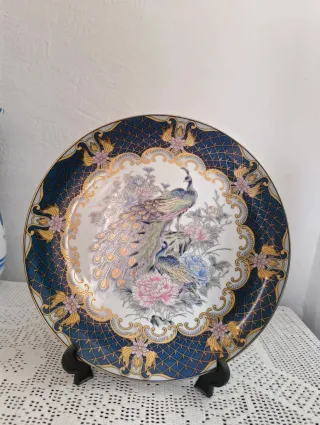 Precioso plato decorativo de cerámica japonesa. - Diseño con pavos reales y flores. - Borde con detalles dorados y azul marino. - Ideal para coleccionistas o decoración.