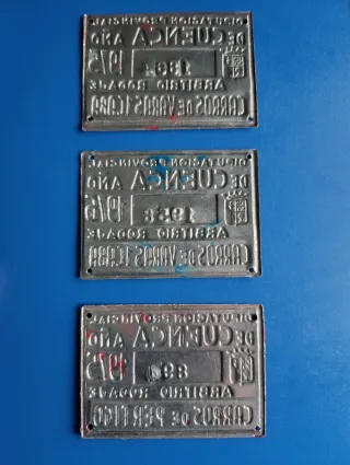 Conjunto de tres matrículas antiguas de la Diputación Provincial de Cuenca. - Matrícula de 1975, Carros de Pertigo, número 894. - Matrícula de 1976, Carros de Varas 1Caba, número 1958. - Matrícula de 1975, Carros de Varas 1Caba, número 1864. Medidas: 9cm de largo x 6,3cm de alto. Están nuevas sin usar. Precio por unidad.