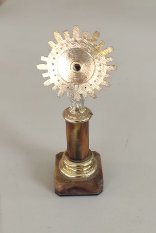 Figura de la Virgen del Pilar, patrona de Zaragoza. Representación religiosa con detalles. - Base con inscripción Ntra. Sra. del Pilar Zaragoza. - Columna con detalles dorados y cruz. - Figura de la Virgen con aureola. - Mide aproximadamente 10 cm de alto.