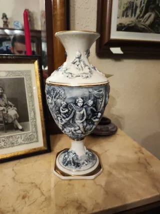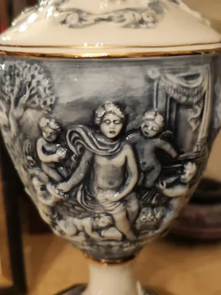 Este es un jarrón o tibor de porcelana de estilo Capodimonte, con tapa y decoraciones en relieve de escenas neoclásicas en azul y blanco. Es un objeto ornamental muy apreciado por coleccionistas. El estilo Capodimonte es conocido por la porcelana artística italiana. Presenta escenas detalladas con figuras en relieve, a menudo querubines o personajes mitológicos. Medidas 32 x 15