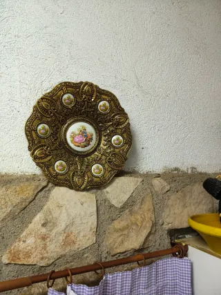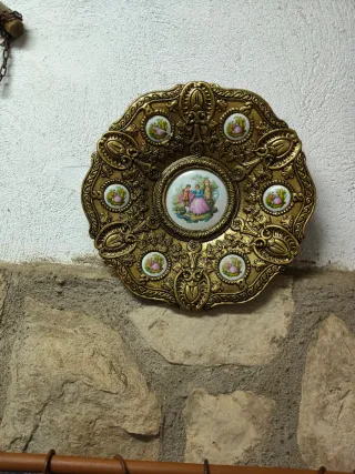 Precioso plato decorativo de bronce con detalles en porcelana, ideal para coleccionistas. - Diseño intrincado en bronce. - Miniaturas de porcelana con escenas. - Pieza de colección única.