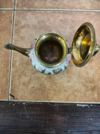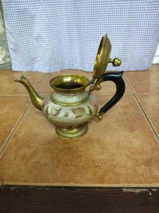 Tetera de bronce con un diseño artesanal único. - Material: Bronce. - Decoración: Dibujos florales y hojas. - Tapa: Con pomo dorado y bisagra.