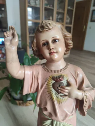 Figura decorativa del Niño Jesús con el Sagrado Corazón. - Detalle del Sagrado Corazón en el pecho. - Gestos de bendición y protección. - Tonos rosados y dorados.