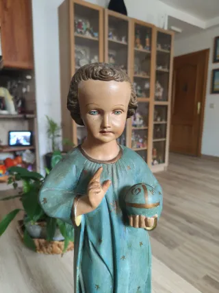 Figura decorativa del Niño Jesús sosteniendo un globo terráqueo. - Detalle de las estrellas pintadas en la túnica. - Tono azulado en la vestimenta. - Expresión facial serena.