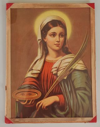 Lámina religiosa de Santa Lucía, protegida con cristal. Mide aproximadamente 24 x 18 cm.