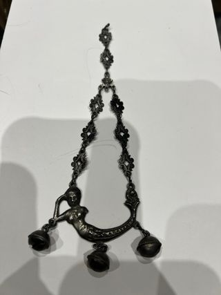 En venta espectacular sonajero antiguo de plata con la icónica forma de sirena, una pieza clásica de la orfebrería tradicional española. Este tipo de objetos no eran solo juguetes, sino potentes amuletos protectores (brincos) que se colgaban en las cunas o en el pecho de los niños para protegerlos del "mal de ojo" y otras dolencias. Material: Plata maciza (presenta una hermosa pátina antigua). Motivo: Sirena finamente cincelada con un brazo sobre la cabeza, iconografía típica de la época que simboliza protección. Detalles: Incluye dos cascabeles colgantes originales que emiten un sonido claro, diseñado tradicionalmente para ahuyenta