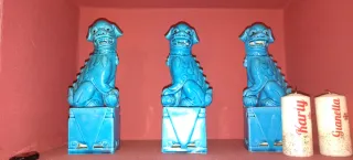 Conjunto de tres figuras decorativas de dragones chinos, conocidos como Fu Dogs. Fabricados en porcelana de un vibrante color azul. - Diseño tradicional de Fu Dogs. - Acabado brillante en porcelana azul. - Piezas decorativas para el hogar.