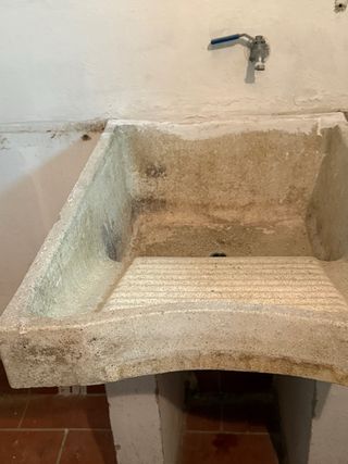 Pila de lavar antigua fabricada en piedra. Su diseño rústico y material la hacen una pieza única. - Material: Piedra. - Estilo: Antiguo.