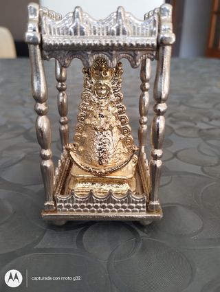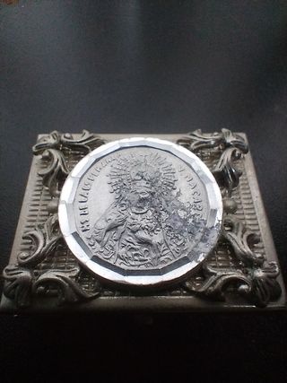 ANTIGUA Virgen del Rocío de metal plateado en perfectas condiciones. Medidas9×5 cm. Peso 273 gramos.