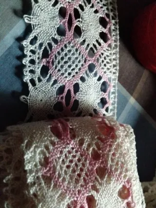Preciosa puntilla de encaje con un delicado diseño. - Color blanco con detalles en rosa. - Tejido de encaje intrincado. - Borde festoneado. Larga 1 metro 60 por 8 cm de ancho