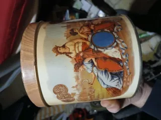 Recipiente de barro de estilo antiguo, ideal para coleccionistas o decoración rústica. - Material: Barro cocido. - Color: Tonalidades anaranjadas y marrones. - Diseño: Con asa y borde ensanchado.