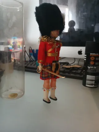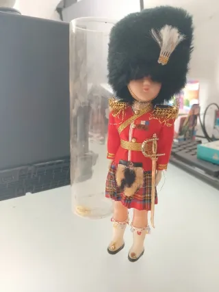 Muñec antiguo de coleccionista, vestida como un guardia real. - Uniforme rojo con detalles dorados. - Gorro alto de pelo negro. - Falda de cuadros escoceses. - Botas blancas con adornos.