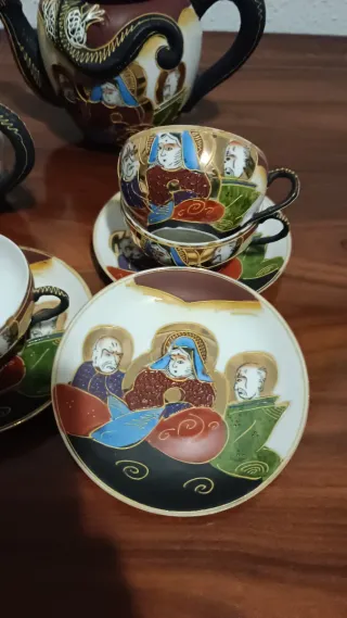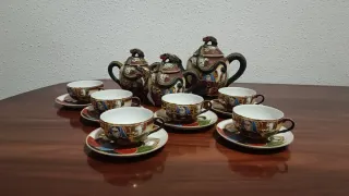 Precioso juego de té de porcelana Satsuma, originario de Japón. Piezas decoradas a mano con motivos tradicionales. - Juego de té de porcelana Satsuma. - Decoración pintada a mano. - Incluye tetera y tazas con sus platillos. - Sin usar, en perfecto estado.