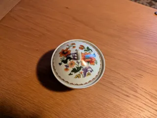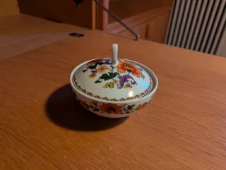 Elegante caja de porcelana con un diseño floral. 10,5cm ancho 10cm alto - Tapa con asa. - Decoración de flores en tonos naranjas, morados y verdes. - Borde decorado con pequeños motivos.