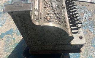 Máquina registradora antigua de la marca National. - Diseño metálico ornamentado. - Teclado con números. - Cristal superior.