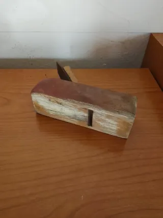 Herramienta de carpintería antigua, fabricada en madera. - Cuerpo principal de madera con detalles en rojo. - Pieza de corte de metal. - Diseño clásico de cepillo de mano.